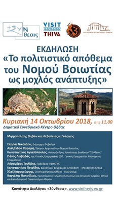 Η Κοινότητα Διαλόγου «Σύνθεσις» (http://www.sinthesis-eu.gr) συνδιοργανώνει με τον Δήμο Θηβαίων και την Εφορεία Αρχαιοτήτων Βοιωτίας εκδήλωση με θέμα «Το πολιτιστικό απόθεμα του Νομού Βοιωτίας ως μοχλός ανάπτυξης».